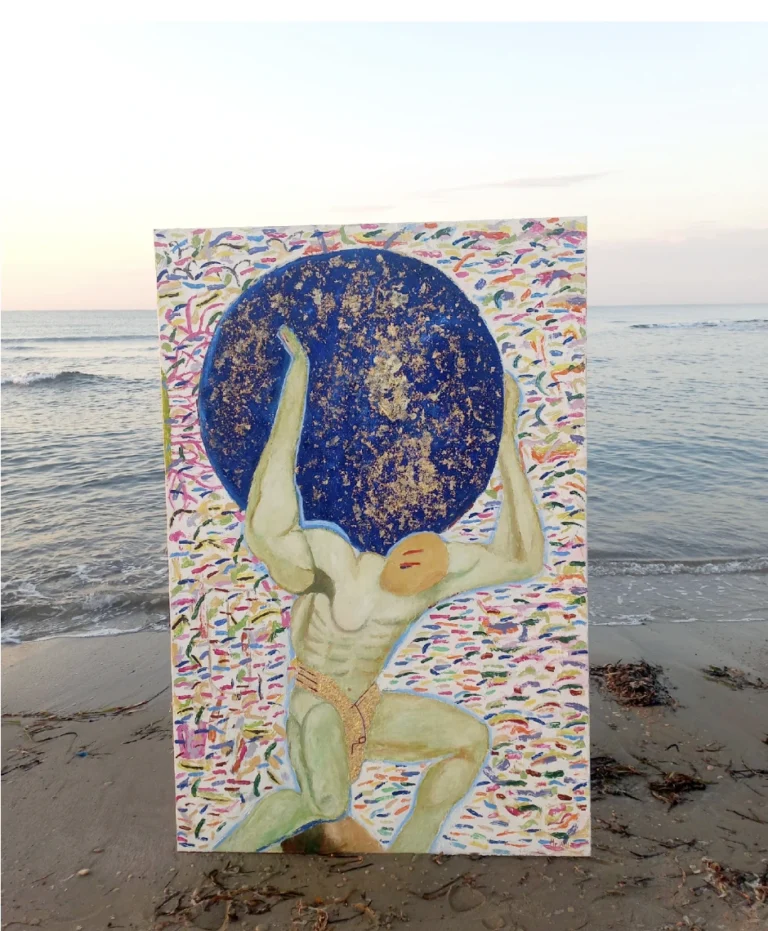 La imagen de la obra artística que he elegido, y en la que muchas veces me veo reflejado, es la de un atlas soportando el mundo, representado con un color azul marino muy intenso, esa carga que pesa y golpea representada mediante el pan de oro en desprendimiento, en el que hay orden y desorden con alta sensibilidad emocional, pero que con constancia, perseverancia, atención y foco es superada. Y no es a modo de castigo, sino más bien es preparación, dando a conocer de manera saludable mi valor real.